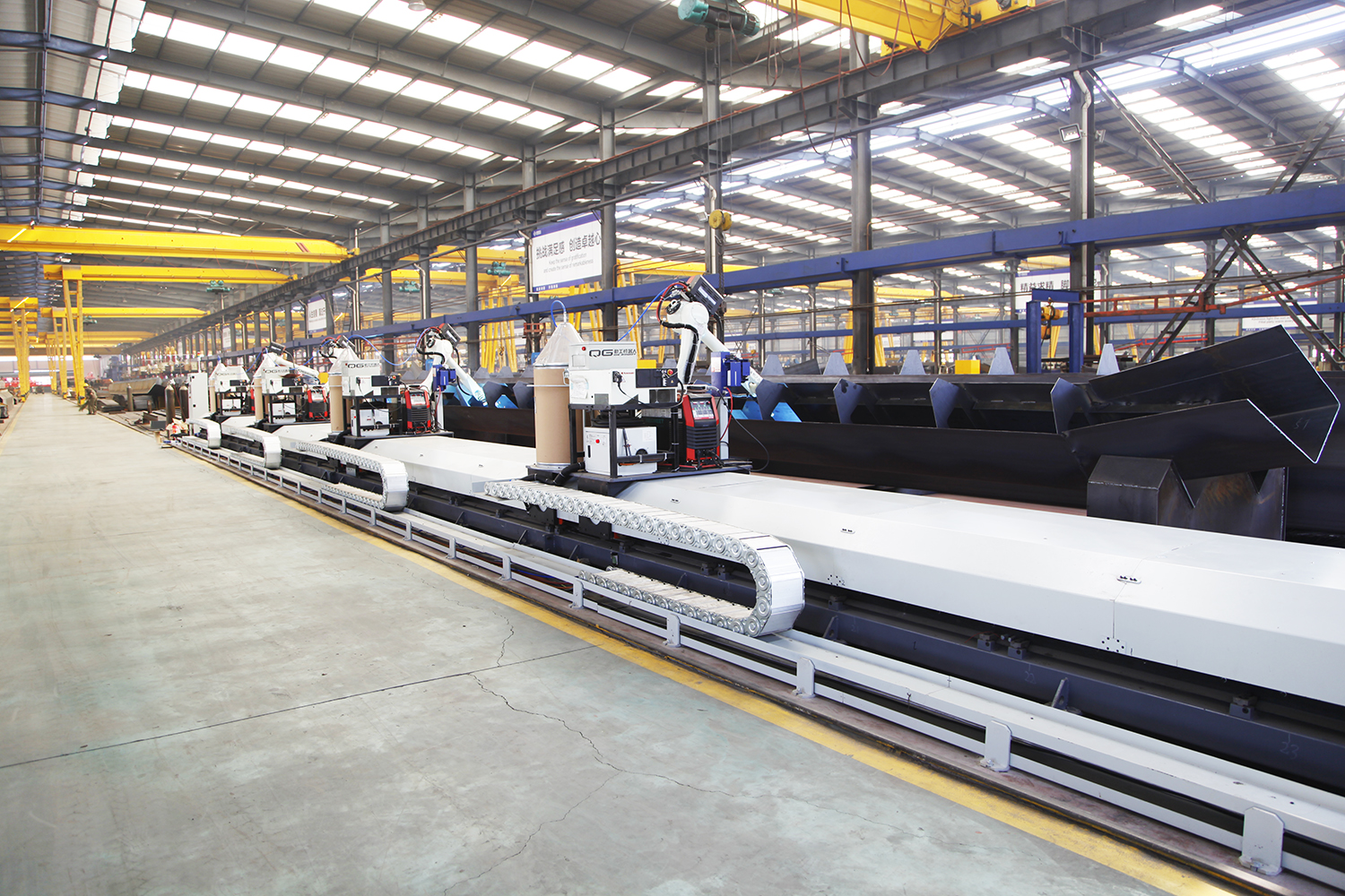 此條焊接流水線長(zhǎng)度25米,安裝有四臺(tái)日本川崎焊接機(jī)器人,可焊接公司標(biāo)準(zhǔn)產(chǎn)品10.5m--22.5m各種規(guī)格單梁內(nèi)縫,焊接范圍包括筋板底部、側(cè)面、板條等一次性焊接完成。